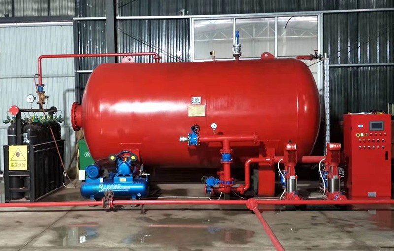 消防氣體頂壓給水設備中消防氣壓水罐是儲水部件,其有效水容積低要求3m3。氣壓水罐均采用補氣型氣壓水罐。該類設備靠大型氣壓水罐提供10min消防初期用水量,不設消防泵組,只設有消防穩壓泵組。主要不同在于氣體頂壓設備采用高壓氣瓶組儲存消防工作時的動力氣源,動力氣源與氣壓水罐分置,當消防指令到達,啟動頂壓系統向氣壓水罐輸入滿足消防工作壓力的壓縮氣體,將罐內消防用水置換排出,消防用水以恒壓狀態供給消防部件。